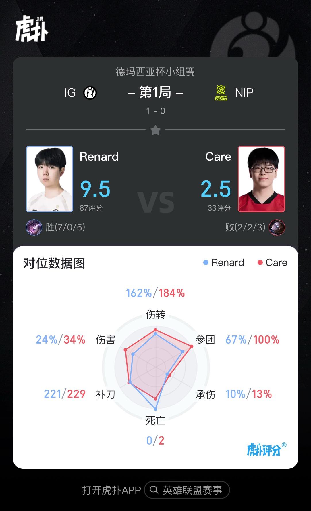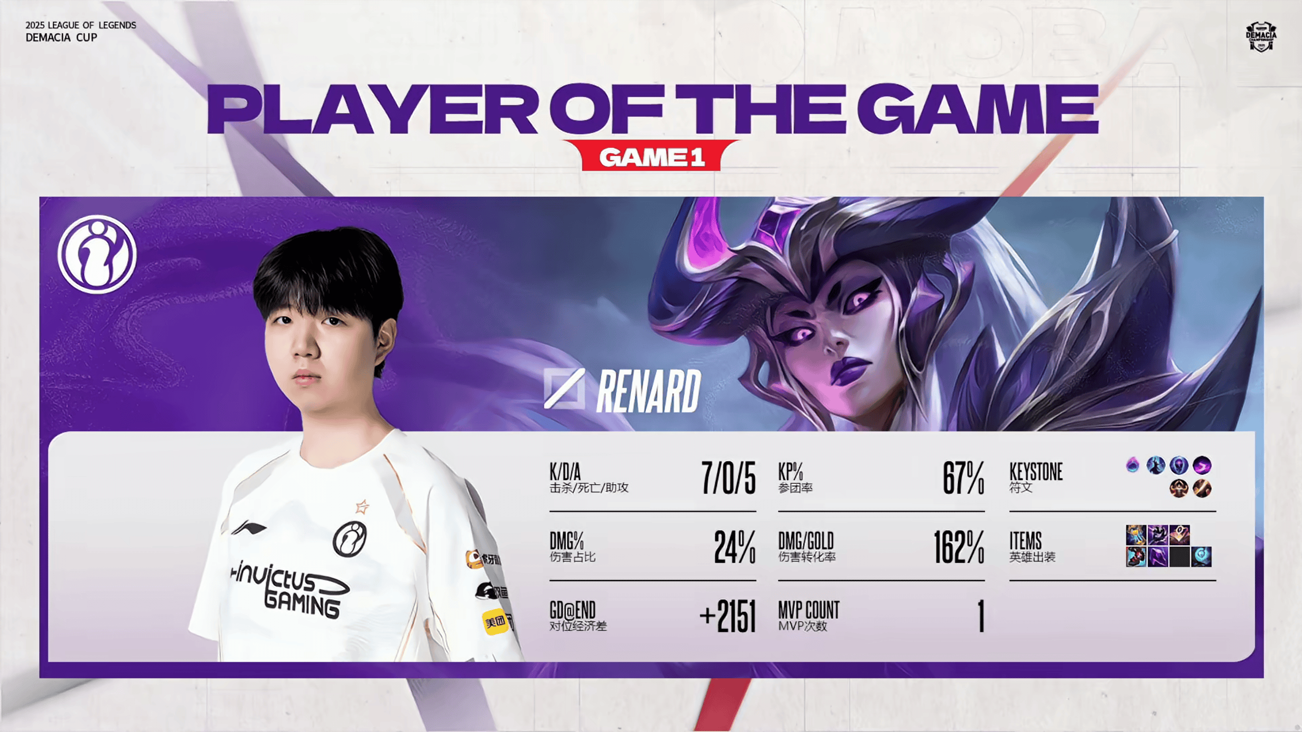 虎扑12月25日讯 在刚刚结束的德杯小组赛IG对阵NIP的比赛中,Renard辛德拉打出7/0/5战绩,拿下IG对阵NIP第一局MVP,这是他第1个MVP。