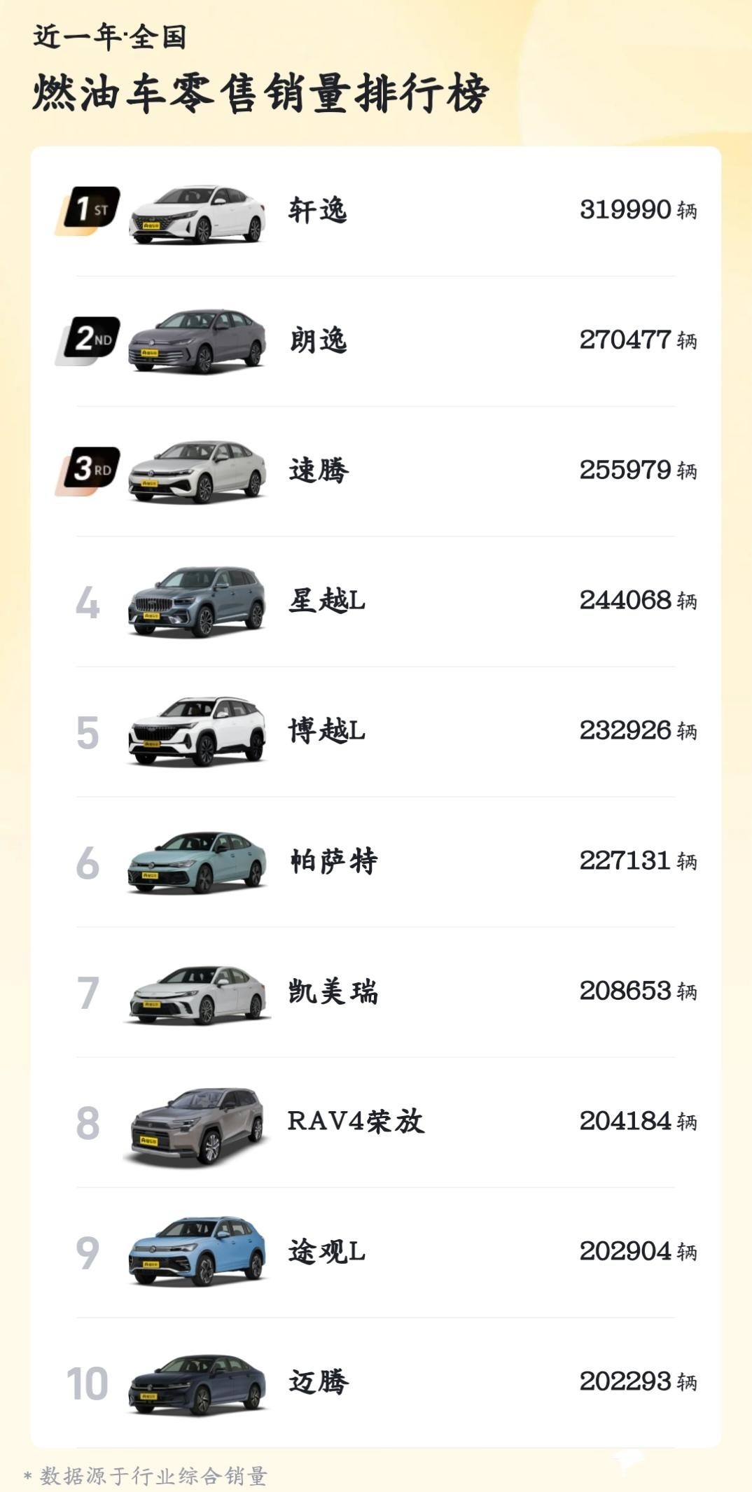 “汽车市场的未来是电动化”,这已成为行业共识,如今新能源汽车的渗透率越来越高,2025年继续超过50%,足见这一趋势。但就在这样的背景下,仍然有不少燃油车活跃在市场中。今天我们就帮大家盘点一下,2025年度销量TOP 10(完整榜单位于文末)的燃油车: